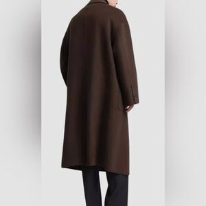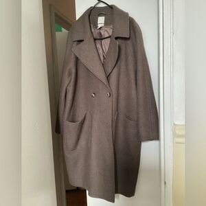 H&M large chocolate mousse brown coat, soft color, oversized, recycled wool blend, lapels, lined, back part, front square pockets, 50” chest, 42” long, quiet luxury, stock pics shows similar but not exact style as my item