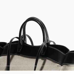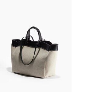 H&M Shopper Tote Bag light beige cream linen-blend canvas black leatherette trim.