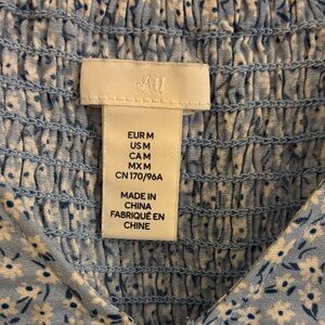 Elegant light blue blouse with floral design. Features ruched front and long sleeves. Perfect for versatile wear.