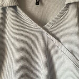 Stylish light blue crop top with a wrap design. Features ribbed texture and long sleeves. Good condition. All items come from a smoke and pet free home.