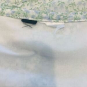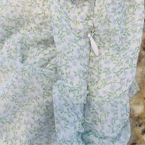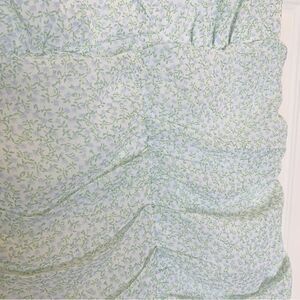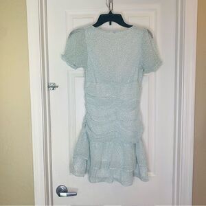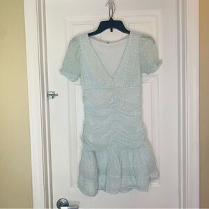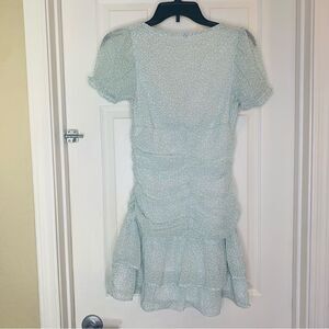 Short dress in woven fabric. V-neck, seam below bust, short puff sleeves, and ruffle-trimmed cuffs with covered elastic. Gathered, fitted bodice with a draped effect, concealed zipper at one side, and skirt with flounced, double tier at hem. Lined.
