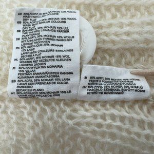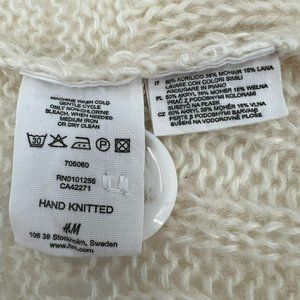 H&M light cream lacey pattern acrylic, mohair, wool cardigan with a shawl collar. Women's size Small. One large button closure in front at waist. "Hand knitted" in Sweden. An extra button is attached to the tag. 50% acrylic, 35% mohair, 15% wool. In excellent pre-owned condition.