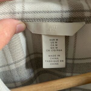 Gently worn light gray and white plaid shacket. Features button-down design. Lightweight, oversized with a side slit.