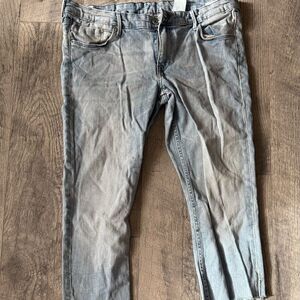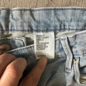 These H&M skinny jeans feature a light washed-out color for a vintage look. The denim has a subtle texture typical of stonewashed styles and includes contrast stitching for added detail.