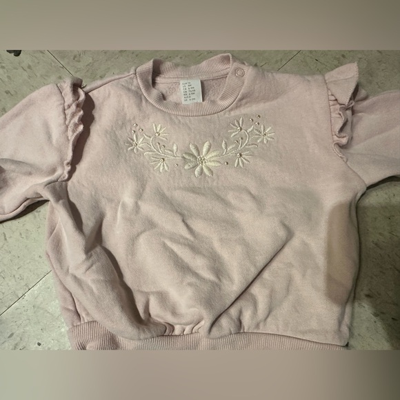 Adorable light pink jacket with ruffle sleeves. Features floral embroidery on the chest. Ideal for layering.