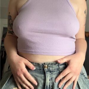 Stylish ribbed crop top in light purple. Ideal for casual wear.