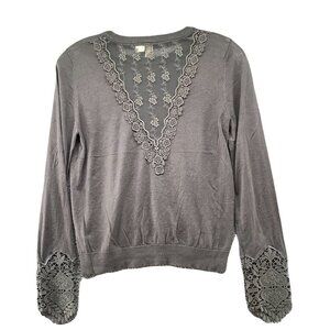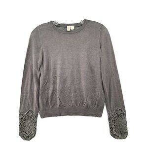 H&M Lightweight Sweater Womens S Crochet Cuff Sheer Lace Back Brown Crewneck