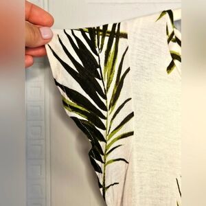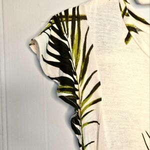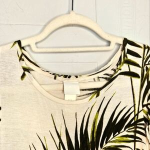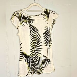 Lightweight rayon summer T-shirt from H & M with scalopped cap sleeves. Ivory with green palm fronds. Sz XS. Excellent used condition.
