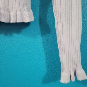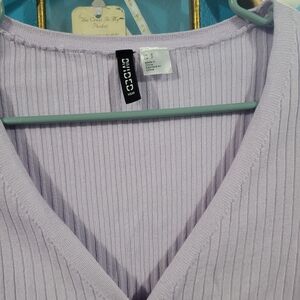 Chic ribbed cardigan. Soft lilac color. Button-up front. Ruffled hem. Perfect for layering. Gently used. See all images.