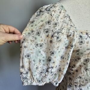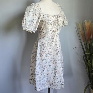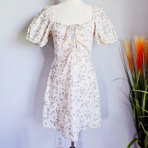 H&M, Linen Blend Beige Ditsy Floral Coastal Puff Sleeve A-line Mini Dress, Size Small