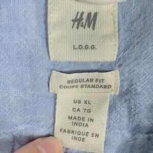 H&M Linen Blend shirt. Men's Size XL or Extra Large. Check measurements as it looks smaller than an XL. Baby Blue Linen Cotton Blend. Button Front. Washed and ready to wear. No blemishes that I am aware of. See photos for measurements and details. Coastal, Beachy, Preppy, Work, Office, Party styles.