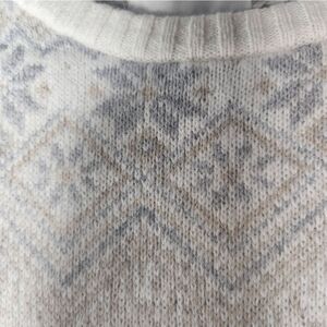 Soft and thick white sweater with beautiful fair Isle color and cuff detailing. Blend of cotton, viscose, Angora and super soft.