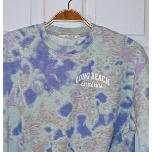 Pastel tie-dye sweatshirt featuring a "Long Beach California" graphic. This stylish and comfortable crew neck pullover from H&M is perfect for adding a touch of Y2K flair to your wardrobe. The unique tie-dye pattern in shades of blue, purple, and green makes it a standout piece. The elasticated hem and cuffs provide a snug fit, while the soft fabric ensures all-day comfort. Ideal for casual outings, relaxed weekends, or cozy evenings at home.