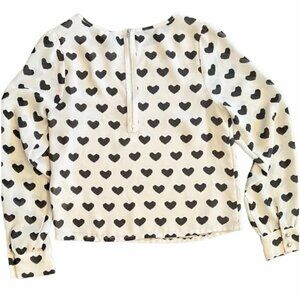 Gently worn H&M long sleeve cream blouse with cute black hearts pattern. Exposed-zipper back opening with silver buttons on sleeves. Item comes from a pet-free and smoke-free home.