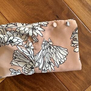 This pinkish cream colored blouse has white and black floral print, ruched neckline, keyhole clasp back neckline