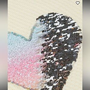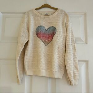 Soft cream sweater with a colorful sparkly flip sequin heart motif.