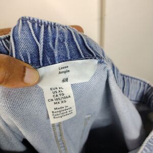 The product is a pair of H&M loose fit elastic drawstring waist cargo wide leg jeans in size XL. They are made of cotton denim fabric with a solid blue color. These versatile jeans feature an elastic waist and adjustable drawstring closure for added comfort and convenience. The wide-leg design and cargo style give a relaxed and trendy look, making them perfect for travel or casual occasions. With ample pockets and the brand's quality assurance, these pants are a stylish and comfortable choice for women looking for a fashionable yet functional wardrobe staple.