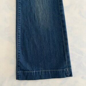 -Details: low rise, flare leg, dark wash, double button & zipper closure, in excellent pre-loved condition