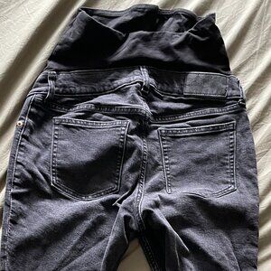 Maternity ankle-length jeans in black/washed denim with gentle stretch. Wide jersey panel at waist for improved fit and mock fly at waistband with a decorative button. Mock front pockets, regular back pockets, and slim legs. Size small. Lightly worn, excellent condition.