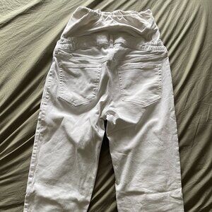 Maternity ankle-length jeans in washed denim with gentle stretch. Wide jersey panel at waist for improved fit and mock fly at waistband with a decorative button. Mock front pockets, regular back pockets, and slim legs. White. Size Small. Lightly worn, excellent condition.