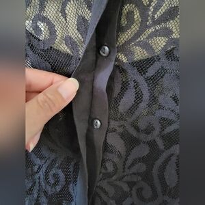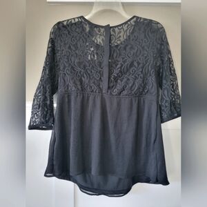 H&M Mama maternity black blouse, with lace detail across the top and along the sleeves, and beaded detail on the front. Pocket buttons along the top of the back, and on the sleeves. 3/4 length sleeves. Elastic waist line.