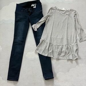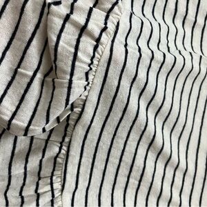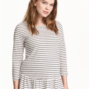 Stay comfy and stylish throughout your pregnancy with this H&M Mama maternity top. Features a classic navy and white stripe pattern, 3/4 sleeves, and a relaxed fit with a ruffled hem—perfect for layering or wearing on its own. Lightweight linen blend fabric keeps you cool and comfortable.