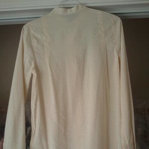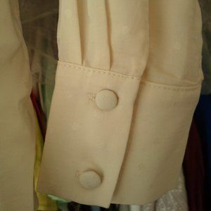 Gorgeous!! The quality of this garment's stitching makes me wonder how it came from H&M, but it did. It's so stunning. Mandarin collar, slightly flared bodice, it drapes to about hip length. Full sleeve, with pleating detail on front placket. Fabric has a subtle polka dot pattern. You can really appreciate the attention to detail in this blouse from the close up picture. Excellent fabrication.