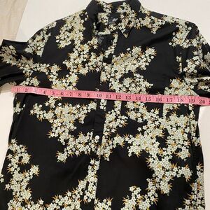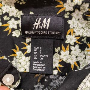H&M men’s floral print button-up shirt in a standard fit. Black base with white and yellow floral pattern throughout. Long sleeves, button front, and lightweight woven fabric — perfect for going out, parties, casual wear, or layering. Gently worn and in great condition with no major flaws.
