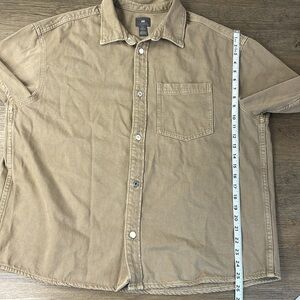 H&M Men’s Khaki Denim Over Shirt, Button Down Long Sleeve, size XL. In great used condition. See pictures for measurements and fabric content.