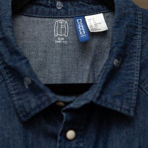 100% Cotton. Dark denim look. Snap buttons. "Slim fit."