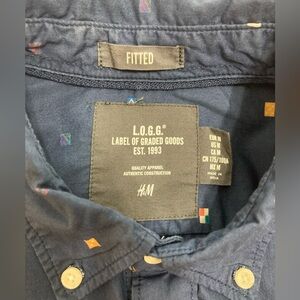 H&M Men’s Medium Navy Blug Nautical Flag Pattern Dress Shirt. “Fitted.” Great condition, never worn.