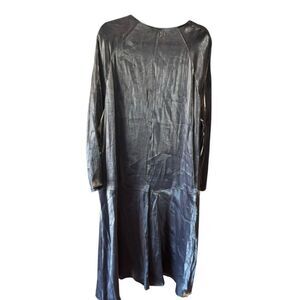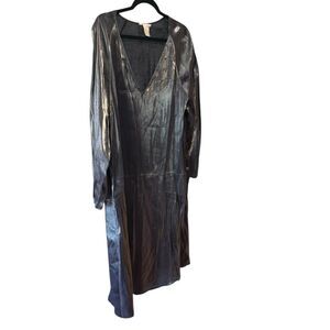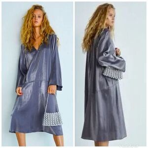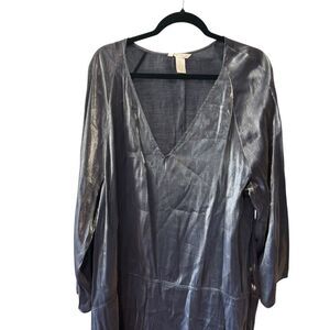 H&M Metallic Gray Silver Shimmer Long Sleeve V Neck Peasant Midi Dress