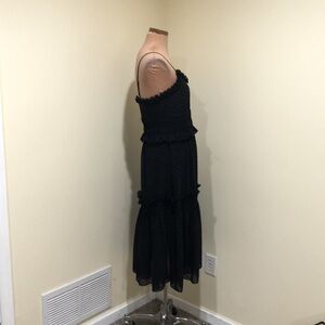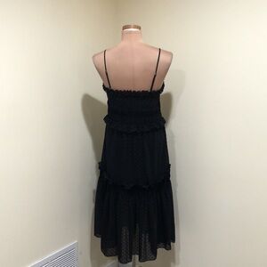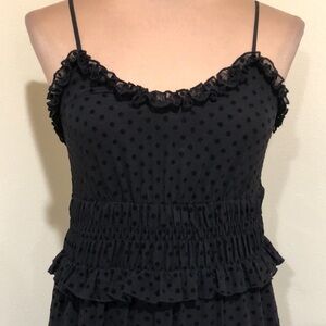 Excellent condition no stains rips or fading. Sleeveless, adjustable spaghetti strap, scoop neck, fit and flare tiered midi dress. Pullover style. The slip lining underneath goes to the lower ruffle, so above the knee. Black ruffle and polka dot pattern.