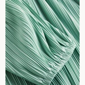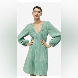Short dress in narrow-pleated jersey with a deep V-neckline and long balloon sleeves with elasticated cuffs. Gathered seam at the waist and a gently flared skirt with a tier at the hem for added width. Lined over the bust.