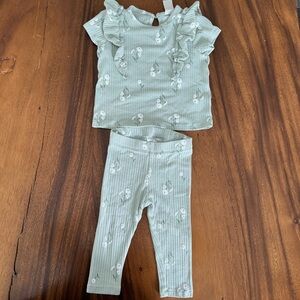 Adorable H&M mint green baby girl outfit in EUC, with ruffled top and floral pattern. Includes matching leggings with adjustable waist. Size 9M.