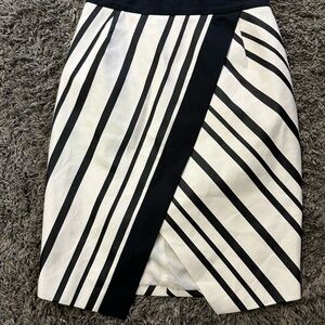 Chic monochrome skirt with bold stripes. Features a modern wrap style. Perfect for versatile styling.