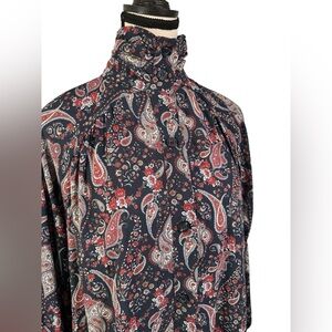 Stylish dress with vibrant paisley design. Features a blend of red, blue, and white. It has a high buttoned color that has ruching. There are buttons down the front. It’s a light and flowy material. Definitely an oversized style.