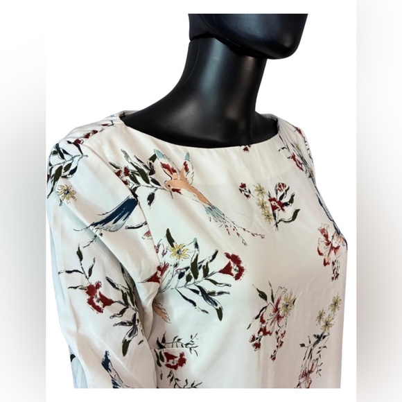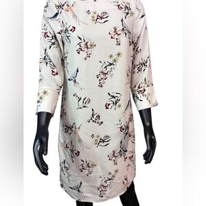 Stylish dress with a vibrant pattern. Features a mix of colors on a light base.