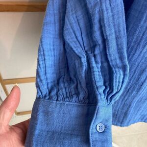 Beautiful cornflower or morning glory blue gauzy not see through blouse. Peasant vibes, beachy. Round collar V neck buttons on each sleeve wrist. Includes extra button. Perfect just not my color🫶 pit to pit 25” shoulder to hem front 26” and back 28”. Lined.