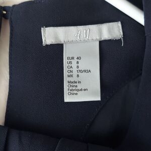 This chic blue sheath dress from H&M features elegant 3/4 bell sleeves and a classic crew neck, making it perfect for work or casual events. Its sleek silhouette offers a sophisticated look, crafted from a solid dark navy blue fabric that ensures a polished appearance.