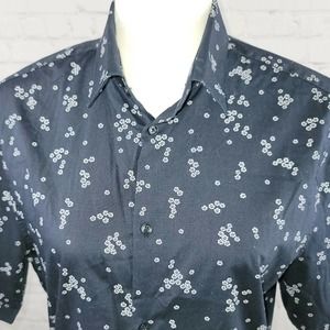 H&M Navy Blue Short Sleeve Button Down Blouse Size M Flower Print