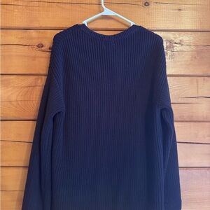 Navy ribbed knit cardigan from H&M. Features a round neckline and gold-tone buttons down the front. Front patch pockets for simple styling. Versatile layering piece for cool days.
