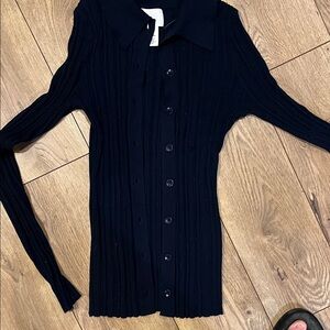 Elegant navy ribbed cardigan with button-up design. Features a classic collar. Light weight