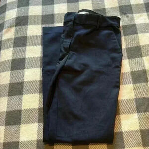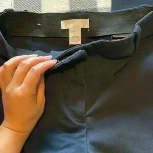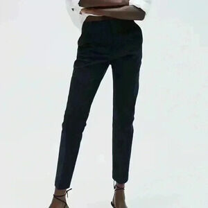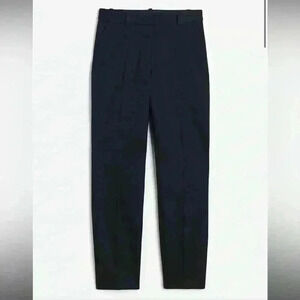 Ankle-length slacks in woven stretch fabric. Regular waist, concealed elasticized waistband, and zip fly with concealed hook-and-eye fastener. Side pockets, mock back pockets, and tapered legs.