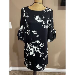 H&M Navy Floral Shift Dress Size 4 3/4 Sleeve Bow Cuff Elegant Cocktail NWT