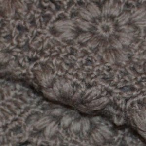 Hand-knit in Nepal, best-selling Nirvanna Designs flower crochet handwarmers in vintage Cinder, grey with a hint of walnut.