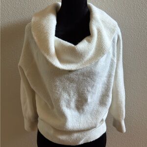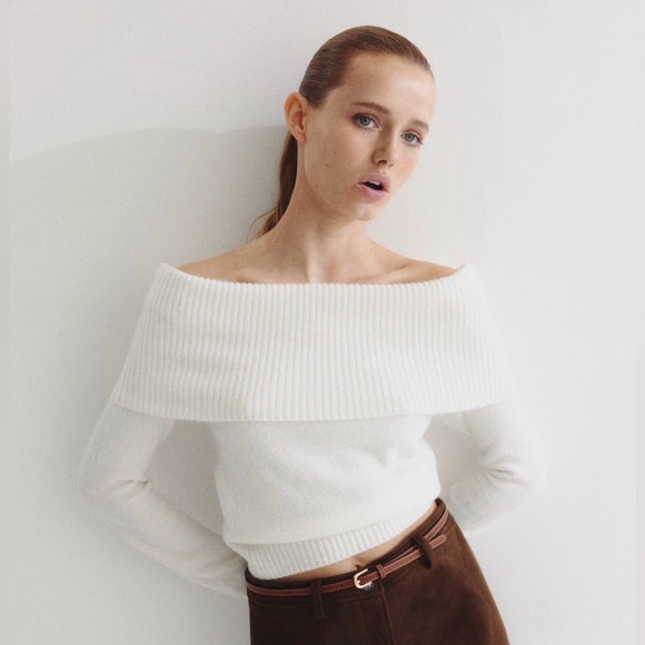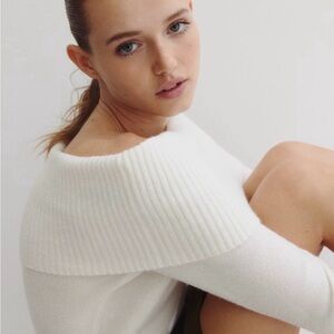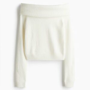 Elegant off-shoulder white sweater with a wide rib-knit neckline. Soft, fitted design that flatters the silhouette. Lightweight and comfortable for layered or standalone wear. White color offers versatile styling options. Short, fitted sweater in a soft knit. Wide foldover upper edge, long sleeves, and ribbing at upper edge, cuffs, and hem.