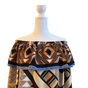 Stand out in this H&M off-the-shoulder top featuring a bold geometric tribal print in rich earth tones. Designed with a wide elastic neckline and ruffle overlay, it offers a flattering boho-chic silhouette. Lightweight and breezy—perfect for summer, festivals, or vacation looks. Size 14 Pair it with denim, skirts, or cutoffs for effortless style.