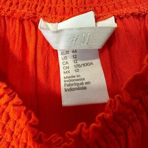 Bright orange off-the-shoulder top. The top features a smocked design at the neckline, hem, and sleeves, giving it a fitted yet comfortable look. The fabric appears to be lightweight and slightly crinkled, which adds texture and a relaxed, bohemian vibe to the garment. The sleeves are short and puffed, complementing the elasticized neckline that can be worn off-the-shoulder or on-the-shoulder, depending on the desired style. This top is perfect for warm weather and can be paired with jeans, shorts, or skirts for a casual, stylish look.