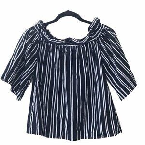 Black and white vertical stripe Bardot / off the shoulder blouse. Has elastic all around top hem. Cropped, wide sleeves. Preowned but in good condition.